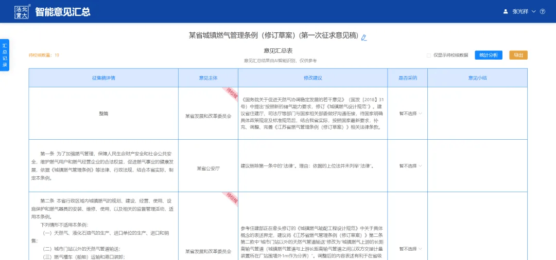 随着法治建设的深入推进,立法精细化程度持续提升,法律法规规章制定过程中的参与主体日益多元。特别是在公开征求意见环节,征集对象广泛,覆盖政府部门、专家学者、行业协会等各类主体。这些主体通常以书面回函形式提交意见建议,数量较多、格式各异。面对形式多样的反馈信息,传统的人工汇总方式在处理效率、数据统计等方面均面临严峻挑战,亟需智能技术赋能。