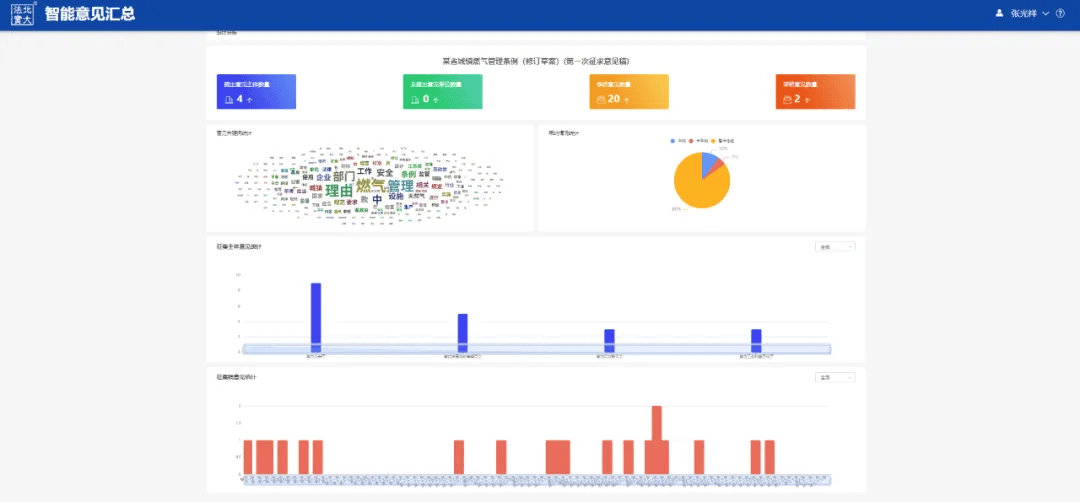 系统提供高效的统计分析功能,可自动生成意见热词云图、各单位意见提交数量、各条款意见数量分布、意见采纳情况统计与对比等多维度图表,直观清晰地展示意见征集的核心焦点、参与情况、条款热度及采纳状态,帮助立法工作者快速了解重点、评估共识分歧,为法规修改和决策提供直接的数据支持。