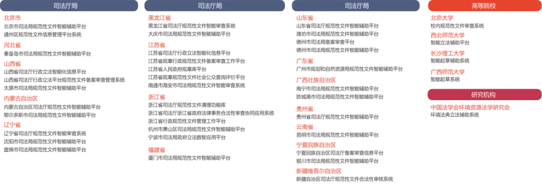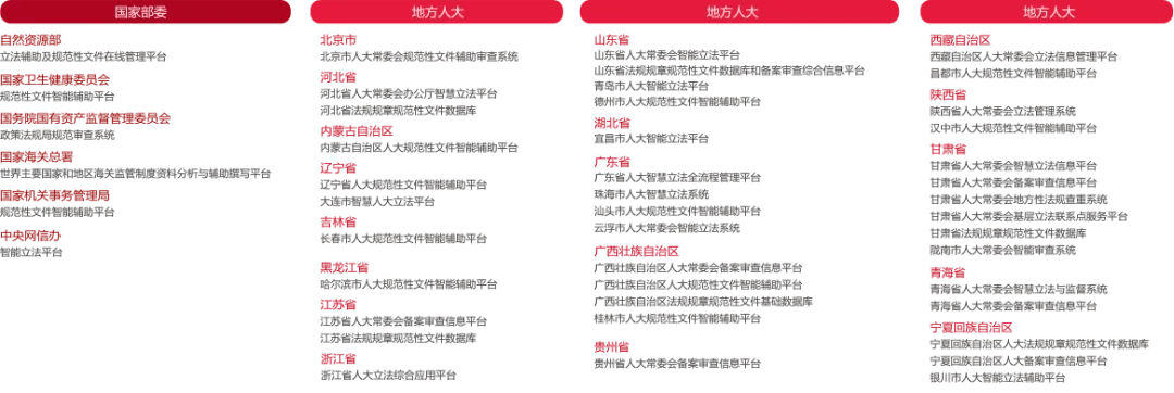 北宝备案审查信息平台目前已服务于河北省人大常委会、广西壮族自治区人大常委会、贵州省人大常委会、陕西省人大常委会等多家立法机关。