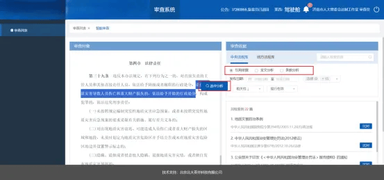 智能审查模块采用先进人工智能技术,支持通过原文引用分析、全文分析、条款分析和选中分析四种分析方式,对审查对象进行多维度比对分析,迅速识别并提取与审查对象最为相似的篇、条及具体的上位法规定,将上述信息直观地展示给用户,帮助用户快速筛选审查重点,聚焦深入审查。