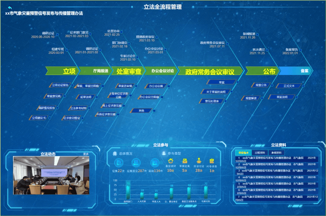 政府立法数智应用立足于行政立法场景,用于浙江省司法厅及各设区的市司法局开展政府立法工作,覆盖规章规范性文件立项、起草、制定、配套规范性文件制定、实施情况报告制定及清理等业务工作,辅助管理立法全过程资料、立法各参与单位共享立法资料以及流程管理、流程可视化展示、立法全流程情况统计、相关业务归档数据库管理等,实现了立法全流程的规范化、精细化管理。