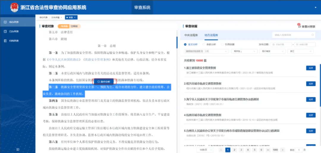 在文件实质审查上充分运用人工智能、大数据分析等现代科学技术,建设了智能审查、原文引用依据、全文分析、条款分析、选中分析、审查对照表、审查意见书、协同审查等便捷功能,解决了行政规范性文件审查过程中依据、参考查找的费时和遗漏问题,实现了上位法及同位法相关规定的智能比对分析,降低了合宪性、合法性风险,提高了审查效率。