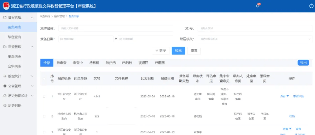 浙江省司法厅构建了集报备、备案、审查为一体的全方位流程系统,通过对整个备案过程的动态管理,实现对各个用户端进行全过程的跟踪和反馈,解决了报送材料不齐备、存储分散、查询不便等问题,一方面实现了行政规范性文件的报送、分发、审核各阶段资料管理的标准化、完备性,另一方面实现了全面在线存储,检索和统计工作的便捷性。