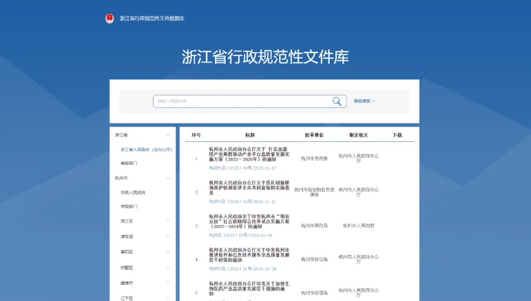 浙江省规范性文件数据库汇集浙江全省行政规范性文件数据,通过与行政规范性文件备案审查平台深入对接,归档文件自动更新进数据库,用于公开查询,提供高级检索、文件按照发布部门、时效性等类别筛选、正文查看、下载等功能。