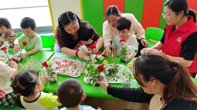 泉州市惠安县崇武镇海门村巾帼志愿者组织亲子家庭在海门村开展母亲节插花活动,并为他们讲述优秀家风家训故事。